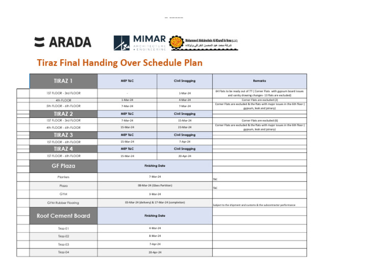 Tiraz Final Handing Over Schedule Plan