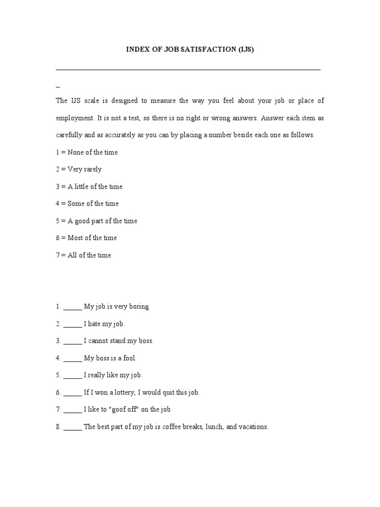 The Index of Job Satisfaction (IJS) scale is designed for use in any organization, program, or work unit as a device to help staff to evaluate their level of job satisfaction. It is designed to produce scores from 0 to 100 where higher scores reflect greater degrees of job satisfaction. Lower scores reflect lower job satisfaction as perceived by those staff that completes the IJS scale. As you will see from reading the items on the IJS scale, most items are negatively worded and a few are positively worded in order to partially control for response set bias. The first step in scoring the IJS scale is to reverse-score the negatively worded items, they are identified as 1,2,3,4,6,7,8,11,13,17,20,21,23,24,27. In order to reverse-score the designated items, merely subtract the respondent's item score from the number 8. For example, if the original score is 3 for one of the designated items, replace it with a score of 5 since 8-3 = 5. Once you have reverse-scored all appropriate items, add up the item scores for all 35 items and post the sum in the space shown below. If any item is omitted or is scored outside the range from 1 to 7, replace it with a score of 0 before computing the sum score. Count the number of items that were properly scored from 1 to 7 and post that number in the space provided for the value of N. Then carry out the computations for the following Steps 3 - 6. 1. SUM X = __________ 2. N = __________ 3. SUM X - N = __________ 4. (SUM X - N) (100) = __________ 5. N * 6 = __________