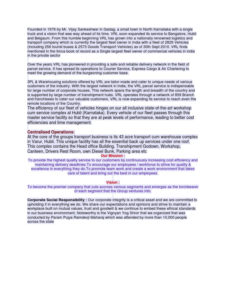 Vijay Sankeshwar in Gadag, a small town in North Karnataka with a single truck and a vision that was way ahead of its time. VRL soon expanded its service to Bangalore, Hubli and Belgaum. From this humble beginning VRL has grown into a nationally renowned logistics and transport company which is currently the largest fleet owner in India with a fleet of 2829 Vehicles (Including 256 tourist buses & 2573 Goods Transport Vehicles) as of 30th Sept 2010. VRL finds mentioned in the limca book of record as a Single largest fleet owner of commercial vehicles in india in the private sector Over the years VRL has pioneered in providing a safe and reliable delivery network in the field of parcel service. It has spread its operations to Courier Service, Express Cargo & Air Chartering to meet the growing demand of the burgeoning customer base. 3PL & Warehousing solutions offered by VRL are tailor-made and cater to unique needs of various customers of the industry. With the largest network in India, the VRL parcel service is indispensable for large number of corporate houses. This network spans the length and breadth of the country and is supported by large number of transhipment hubs. VRL operates through a network of 859 Branch and franchisees to cater our valuable customers. VRL is now expanding its service to reach even the remote locations of the Country.