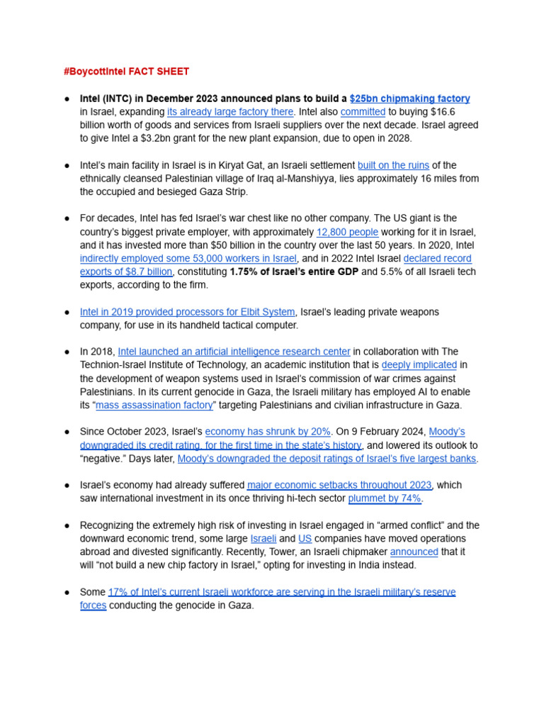 Intel plans to invest $25 billion to expand its chipmaking factory in Israel, which is located on occupied Palestinian land. Intel has heavily invested in and supported Israel's economy and military for decades. However, Intel's market share and technology leadership have declined in recent years, and the company now faces calls to divest from Israel due to its ongoing military occupation and human rights abuses against Palestinians.