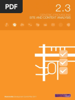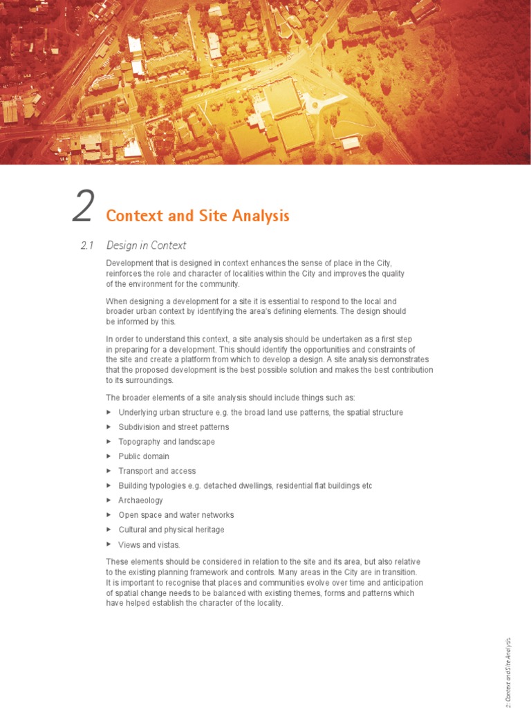 Development that is designed in context enhances the sense of place in the City, reinforces the role and character of localities within the City and improves the quality of the environment for the community. When designing a development for a site it is essential to respond to the local and broader urban context by identifying the areas dening elements. The design should be informed by this. In order to understand this context, a site analysis should be undertaken as a rst step in preparing for a development. This should identify the opportunities and constraints of the site and create a platform from which to develop a design. A site analysis demonstrates that the proposed development is the best possible solution and makes the best contribution to its surroundings. The broader elements of a site analysis should include things such as: