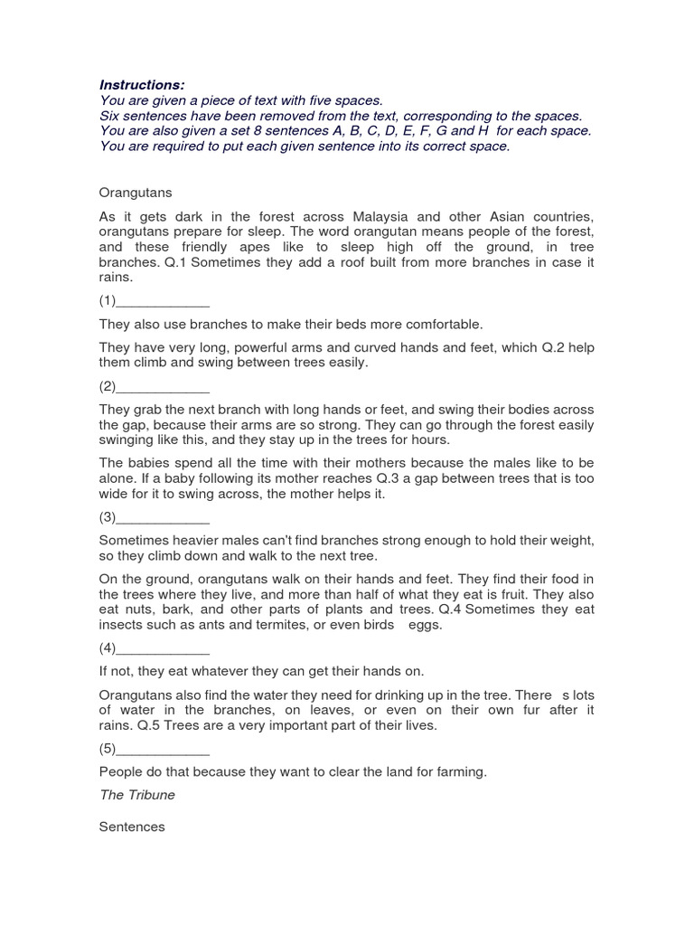 You are also given a set 8 sentences A, B, C, D, E, F, G and H for each space.