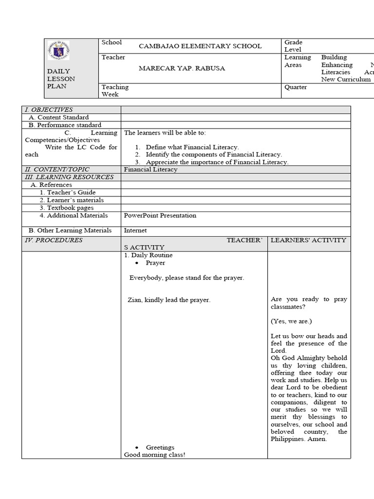 II. CONTENT/TOPIC Financial Literacy