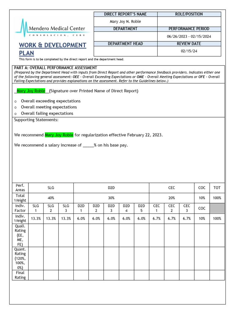 Prepared by Department Head with inputs from Direct Report and other performance feedback providers. Refer to the Guidelines