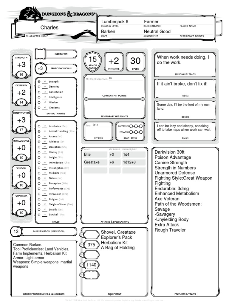 +0 Intimidation (Cha) Greataxe +6 1d12+3 Canine Strength