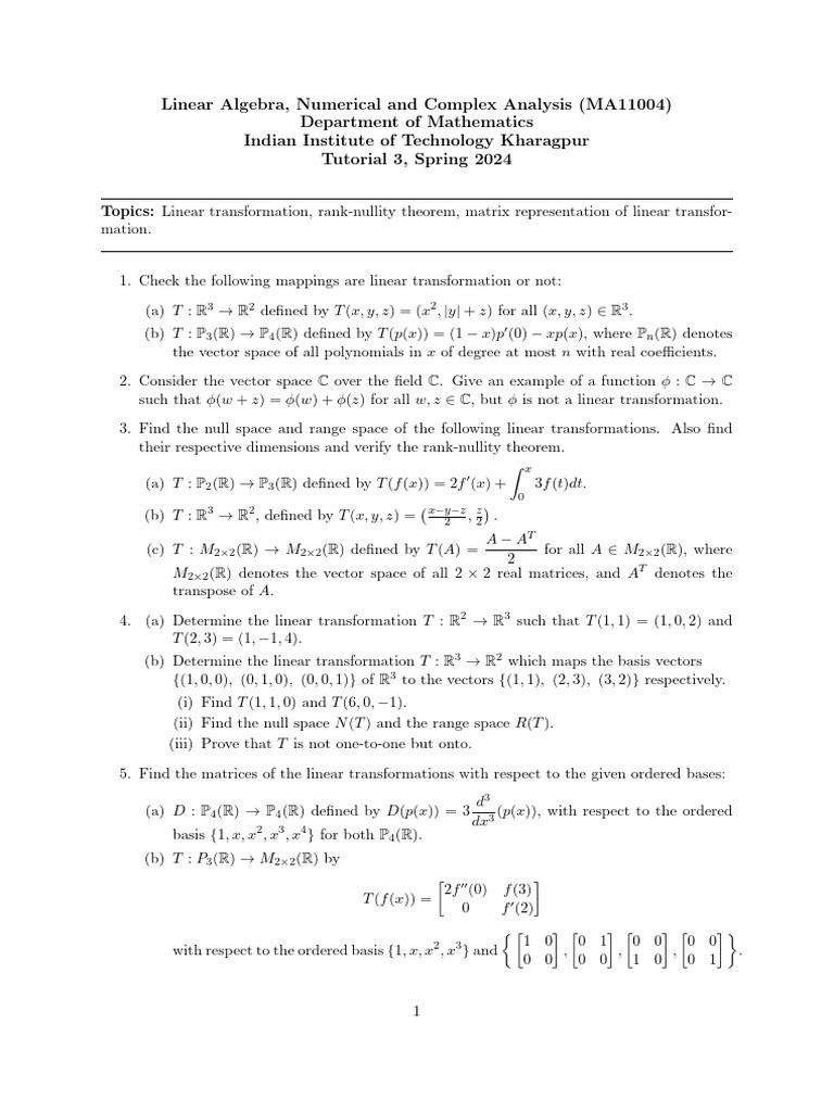 Topics: Linear transformation, rank-nullity theorem, matrix representation of linear transfor-