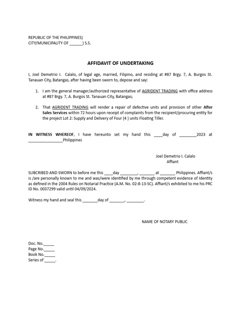 I, Joel Demetrio I. Calalo, of legal age, married, Filipino, and residing at #87 Brgy. 7, A. Burgos St.