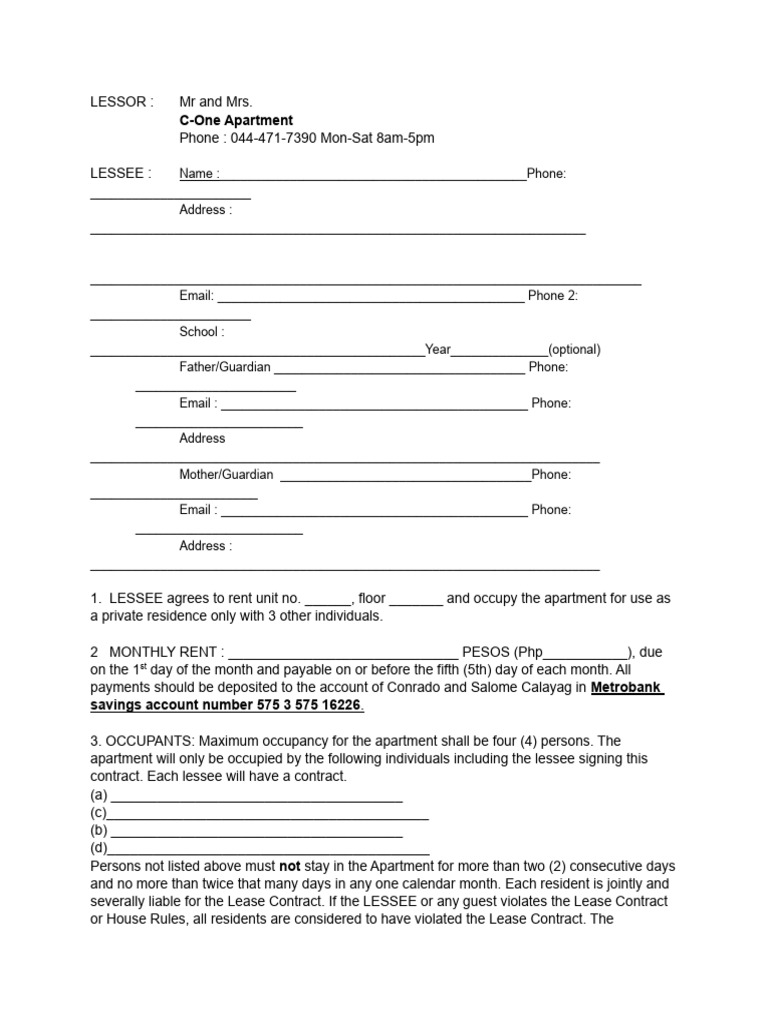 1. LESSEE agrees to rent unit no. ______, floor _______ and occupy the apartment for use as