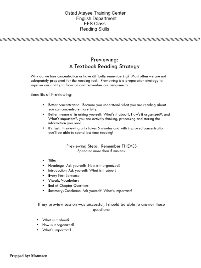 adequately prepared for the reading task. Previewing is a preparation strategy to