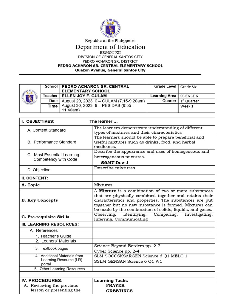School PEDRO ACHARON SR. CENTRAL Grade Level Grade Six