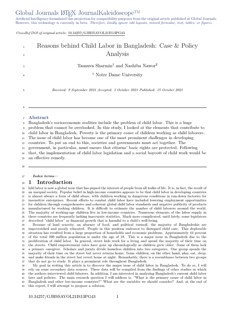 1 Reasons behind Child Labor in Bangladesh: Case & Policy