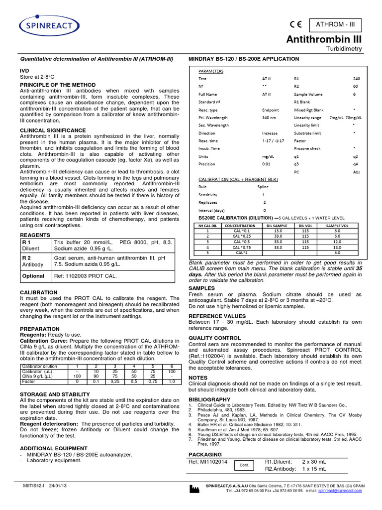 antitrombina III del calibrador por el factor correspondiente indicado procedimiento manual como en automático. Spinreact dispone del PROT