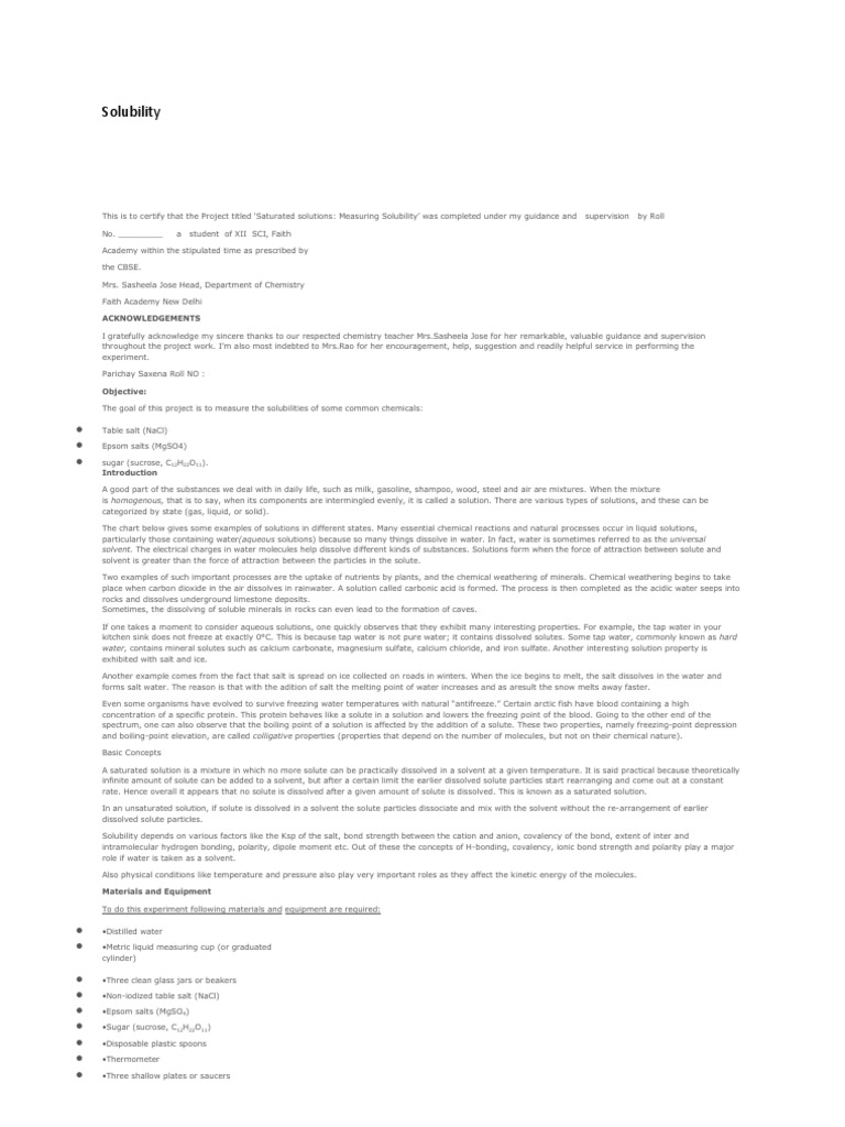 Academy within the stipulated time as prescribed by the CBSE. Mrs. Sasheela Jose Head, Department of Chemistry Faith Academy New Delhi ACKNOWLEDGEMENTS I gratefully acknowledge my sincere thanks to our respected chemistry teacher Mrs.Sasheela Jose for her remarkable, valuable guidance and supervision throughout the project work. Im also most indebted to Mrs.Rao for her encouragement, help, suggestion and readily helpful service in performing the experiment. Parichay Saxena Roll NO : Objective: The goal of this project is to measure the solubilities of some common chemicals:
