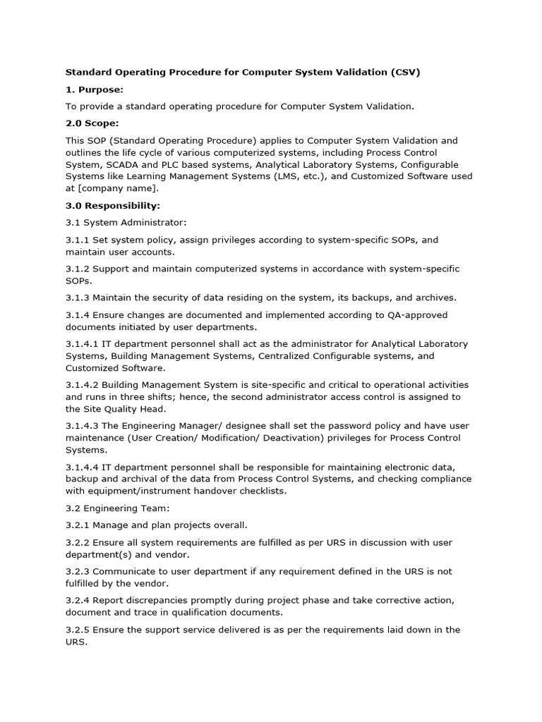 This SOP (Standard Operating Procedure) applies to Computer System Validation and