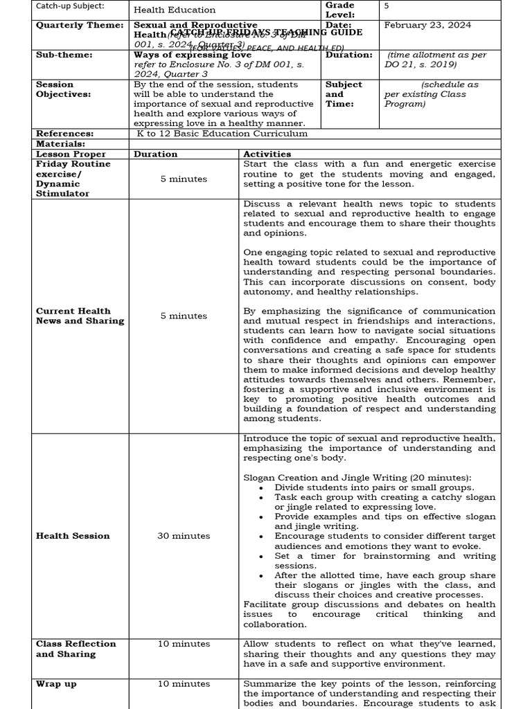 Sub-theme: Ways of expressing love Duration: (time allotment as per