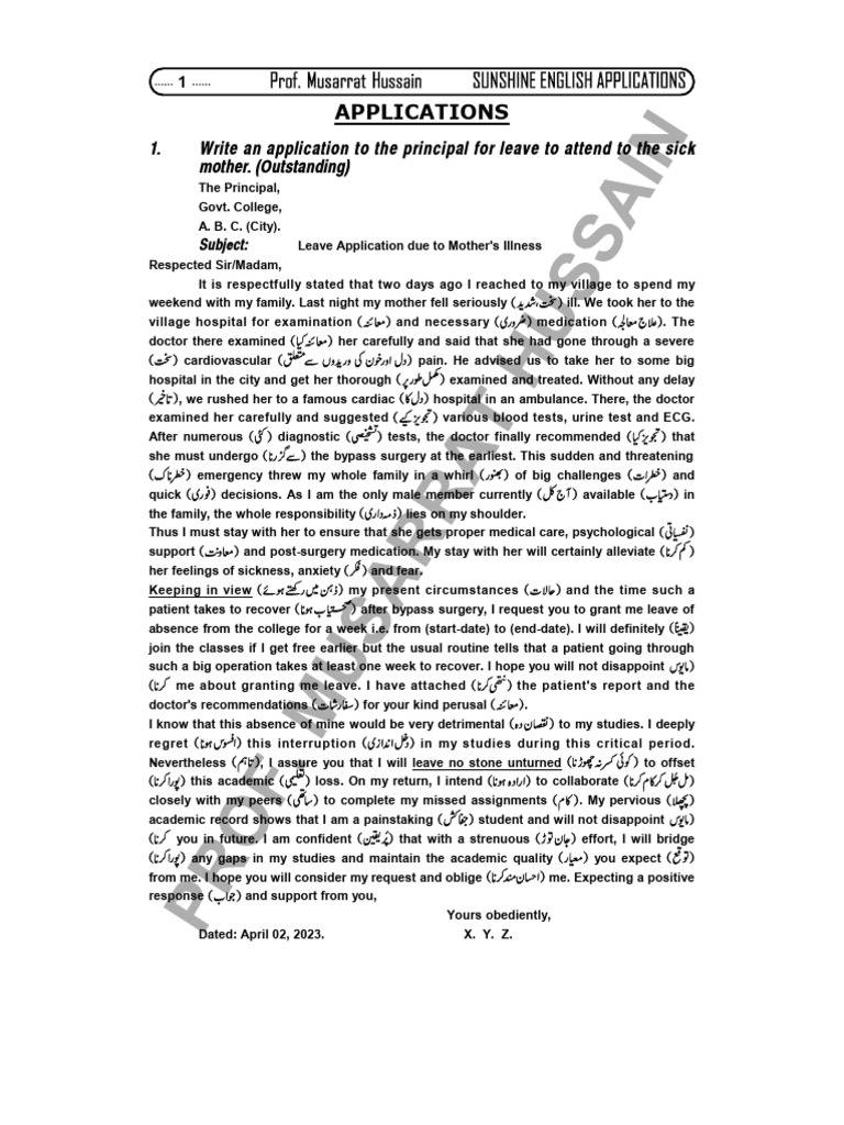 1. Write an application to the principal for leave to attend to the sick