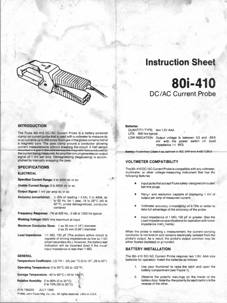 The Fluke 80i-410 DC/AC Current Probe is a battery-powered LIF.E: 600 hrs typical .,