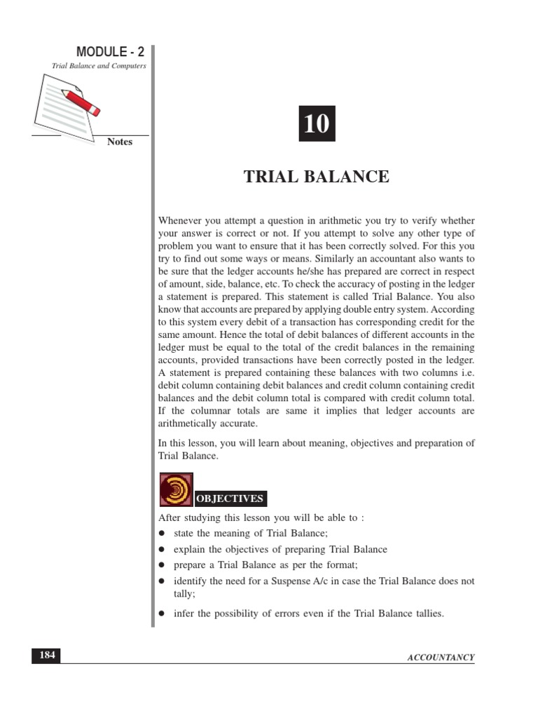 OBJECTIVES After studying this lesson you will be able to : state the meaning of Trial Balance; explain the objectives of preparing Trial Balance prepare a Trial Balance as per the format; identify the need for a Suspense A/c in case the Trial Balance does not tally; infer the possibility of errors even if the Trial Balance tallies.