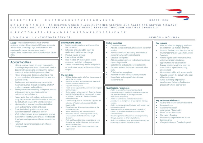 R O L E P U R P O S E – TO DELIVER WORLD CLASS CUSTOMER SERVICE AND SALES FOR BRITISH AIRWAYS