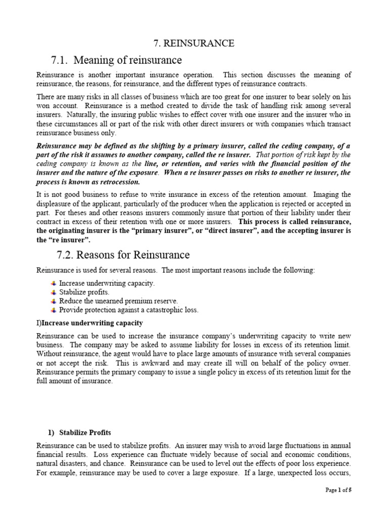 reinsurance, the reasons, for reinsurance, and the different types of reinsurance contracts.