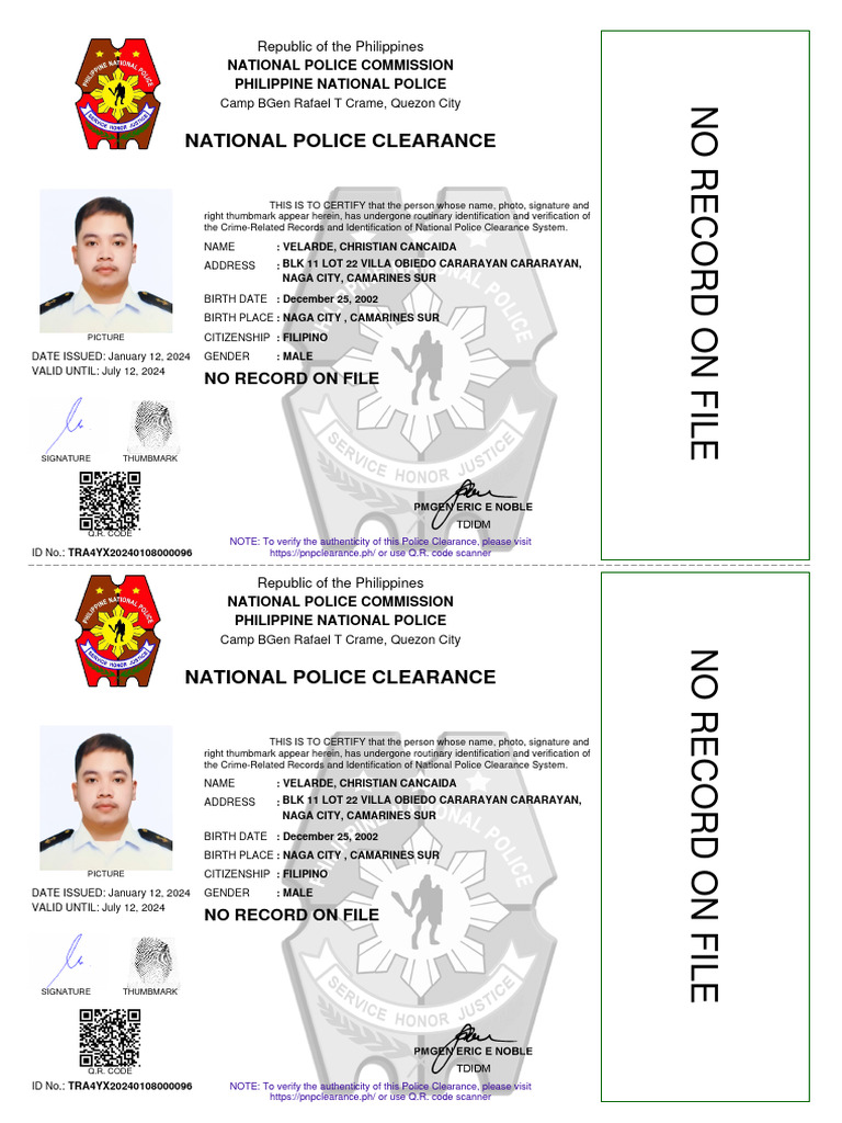 ID No.: TRA4YX20240108000096 NOTE: To verify the authenticity of this Police Clearance, please visit