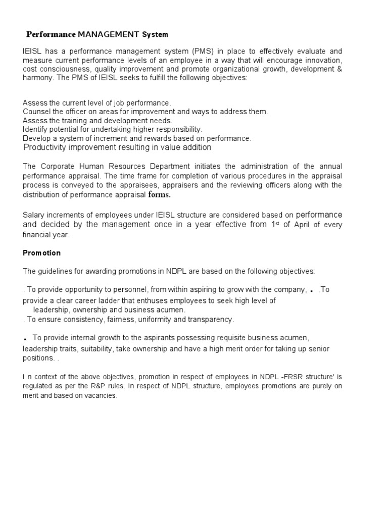 The Corporate Human Resources Department initiates the administration of the annual performance appraisal. The time frame for completion of various procedures in the appraisal process is conveyed to the appraisees, appraisers and the reviewing officers along with the distribution of performance appraisal forms. Salary increments of employees under IEISL structure are considered based on performance and decided by the management once in a year effective from 1st of April of every financial year. Promotion The guidelines for awarding promotions in NDPL are based on the following objectives: . To provide opportunity to personnel, from within aspiring to grow with the company, provide a clear career ladder that enthuses employees to seek high level of leadership, ownership and business acumen. . To ensure consistency, fairness, uniformity and transparency.