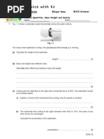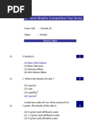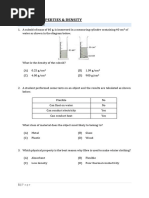 The document appears to be a science test containing multiple choice and structured questions about physical properties such as density, strength, and flexibility of various materials. The multiple choice section includes 10 questions about topics like why helium is used in balloons instead of air, appropriate uses of measurement tools, ordering densities of liquids, material properties, and floating and sinking. The structured questions ask about the meaning and importance of strength, suitable materials for overhead wiring and swings, experimental data involving volume and density calculations, and unit conversions.