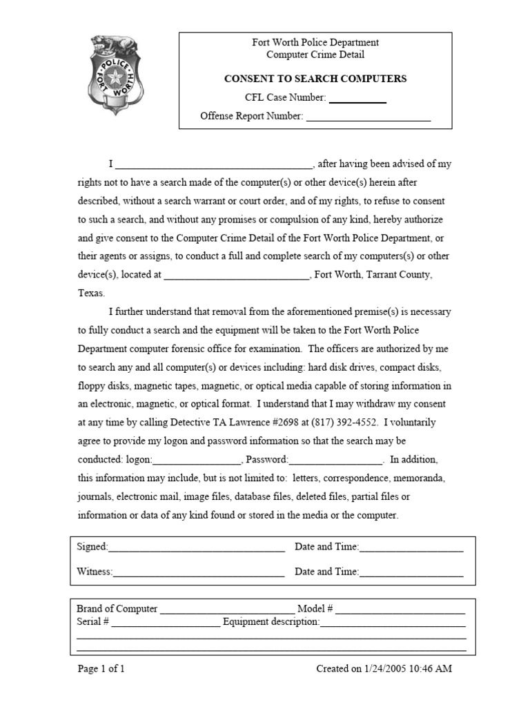 and give consent to the Computer Crime Detail of the Fort Worth Police Department, or