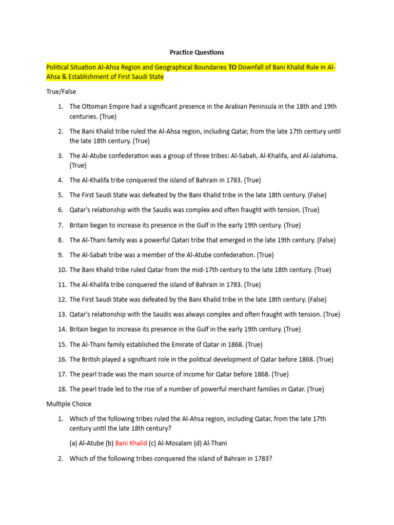 12. The First Saudi State was defeated by the Bani Khalid tribe in the late 18th century. (False)