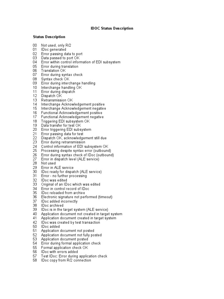 IDOC Status Description Status Description 00 01 02 03 04 05 06 07 08 09 10 11 12 13 14 15 16 17 18 19 20 21 22 23 24 25 26 27 28 29 30 31 32 33 34 35 36 37 38 39 40 41 42 50 51 52 53 54 55 56 57 58 Not used, only R/2 IDoc generated Error passing data to port