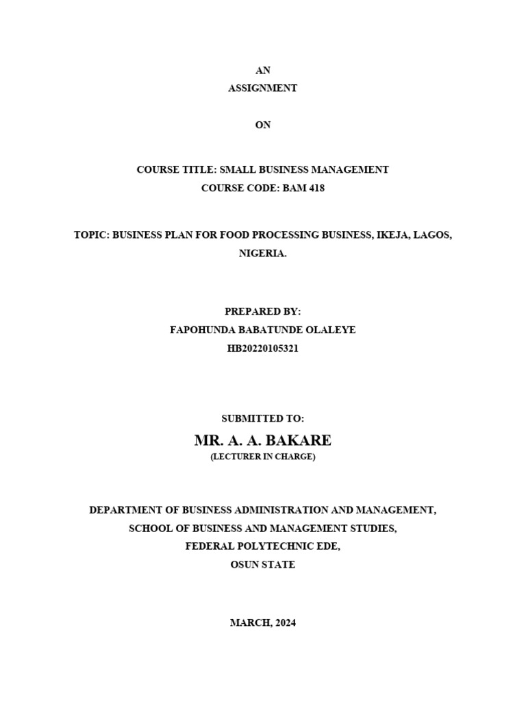 TOPIC: BUSINESS PLAN FOR FOOD PROCESSING BUSINESS, IKEJA, LAGOS,
