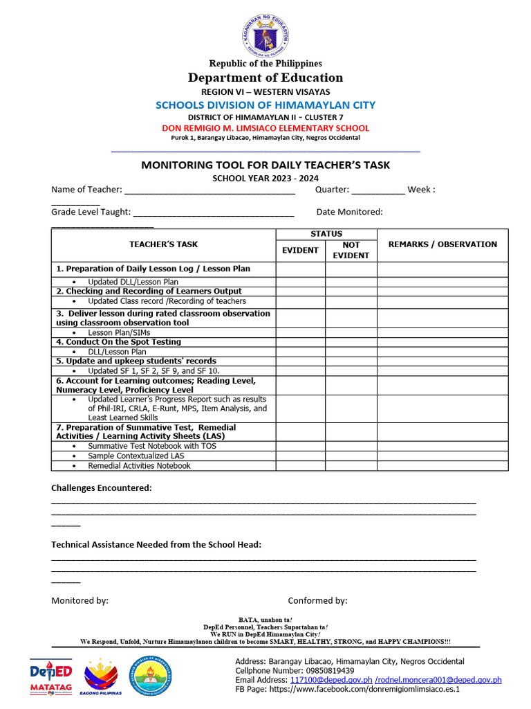 MONITORING TOOL FOR DAILY TEACHER’S TASK