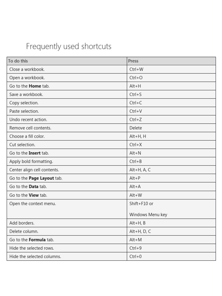 Open the View tab and preview page breaks and layouts, show and hide gridlines Alt+W