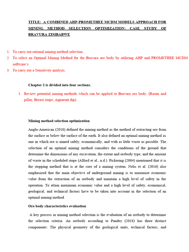 2. To select an Optimal Mining Method for the Bravura ore body by utilizing AHP and PROMETHEE MCDM