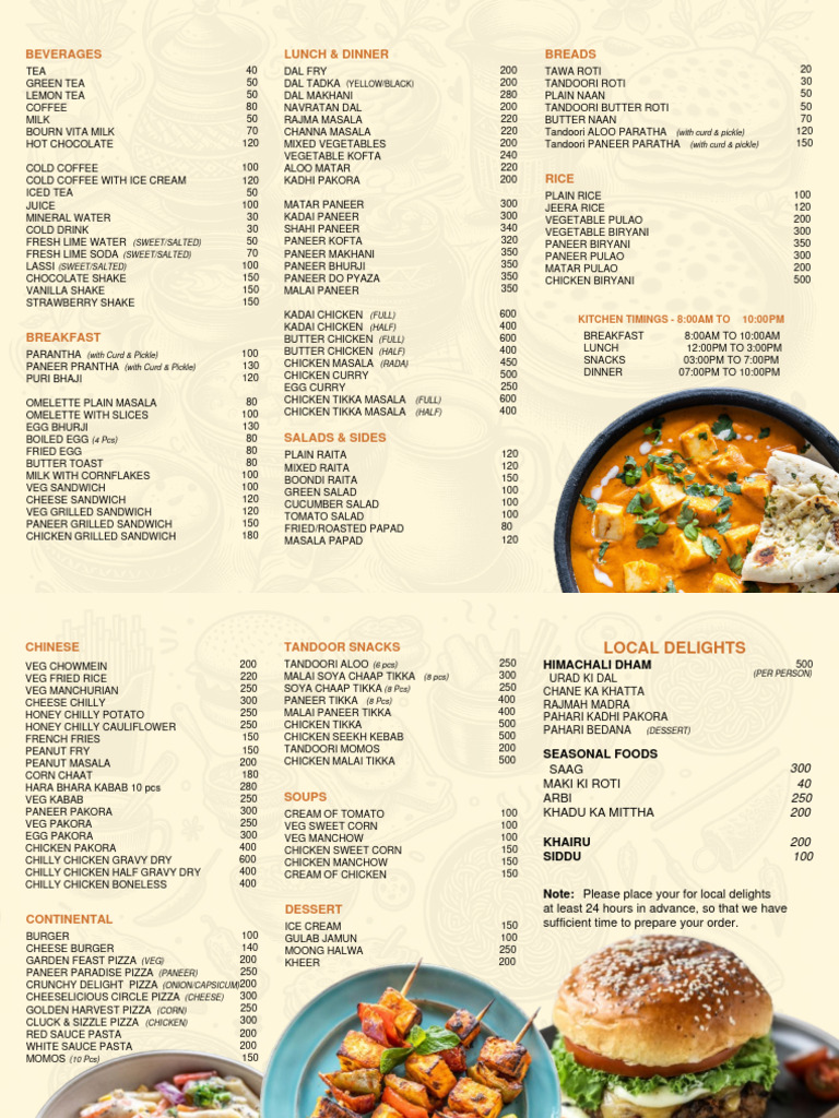 BOURN VITA MILK 70 CHANNA MASALA 220 Tandoori ALOO PARATHA (with curd & pickle) 120