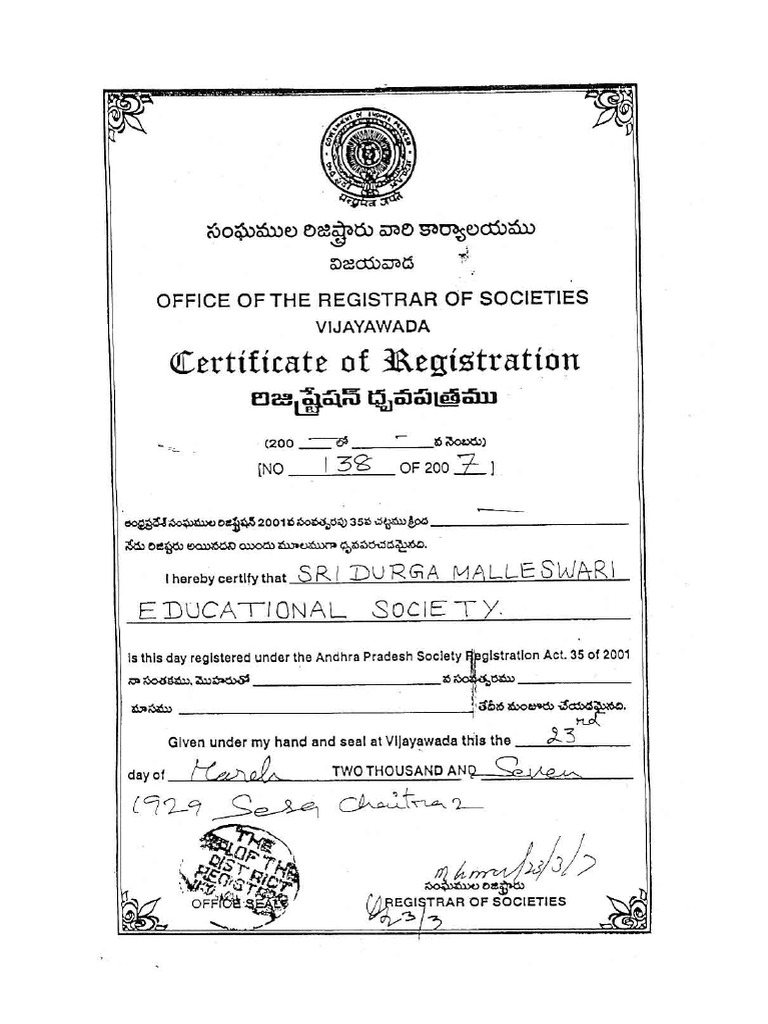 is this day registered under the Andhra Pradesh Soclety Flpglstration Act. 35 of 2001
