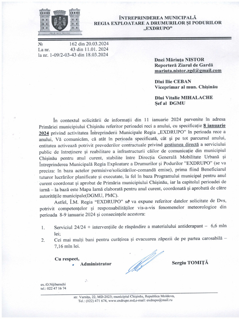 2024 privind activitatea lntreprinderii Municipale Regia ,,EXDRUPO" in perioada rece a
