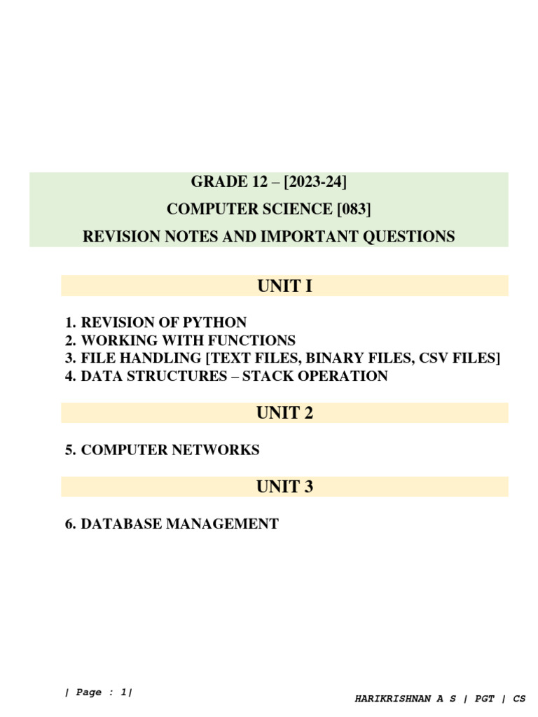 GR 12 - CS - Quick Revision Notes and Important Questions