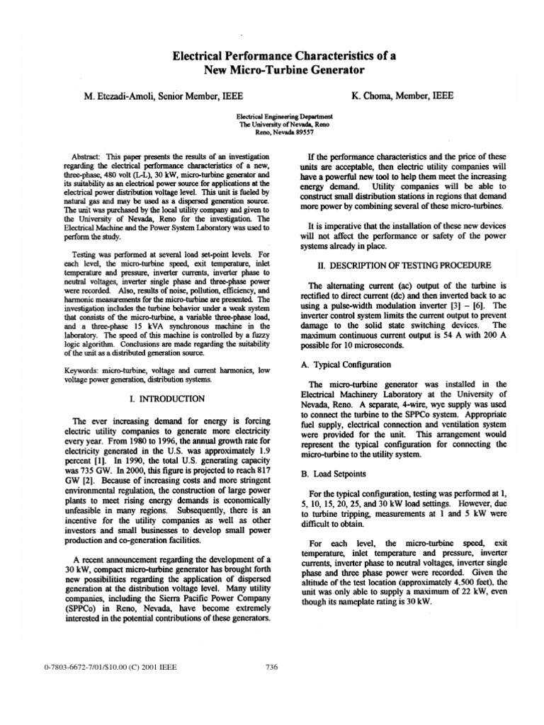 Abstract This paper presenta the nxxdts of an investigation regarding the electrical performance characteristics of a new, three-phase, 480 volt (L-L), 30 kW, micro-turbine generator and its suitability as an electrical power source for applications at the electrical power distribution voltage level. This unit is tiled by naturrd gas and may be used as a dispersed generation source. The unit was purchased by the local utility company and given to the University of Nevada, Reno for the investigation. The Electical Machine and the Power System Laboratory was used to perform the study. Testing was performed at several load set-point levels. For each level, the micro-turbine speedj exit temperature, inlet temperature and pressure, inverter currents, inverter phase to neutral voltages, inverter single phase and three-phase power were recorded. Also, results of noise, pollutio~ etliciency, and harmonic measurements for the micro-turbime are presented. The investigation includes the turbine behavior under a weak system that consists of the micro-turbine, a variable three-phase load, and a three-phase 15 kVA synchronous machine in the laboratory. The speed of this machine is controlled by a fbzzy logic algorithm. Conclusions are made regarding the suitability of the unit as a distributed generation source. Keywords: micro-turbine, voltage and cummt harmonics, low voltage power geuerationj distribution systems.