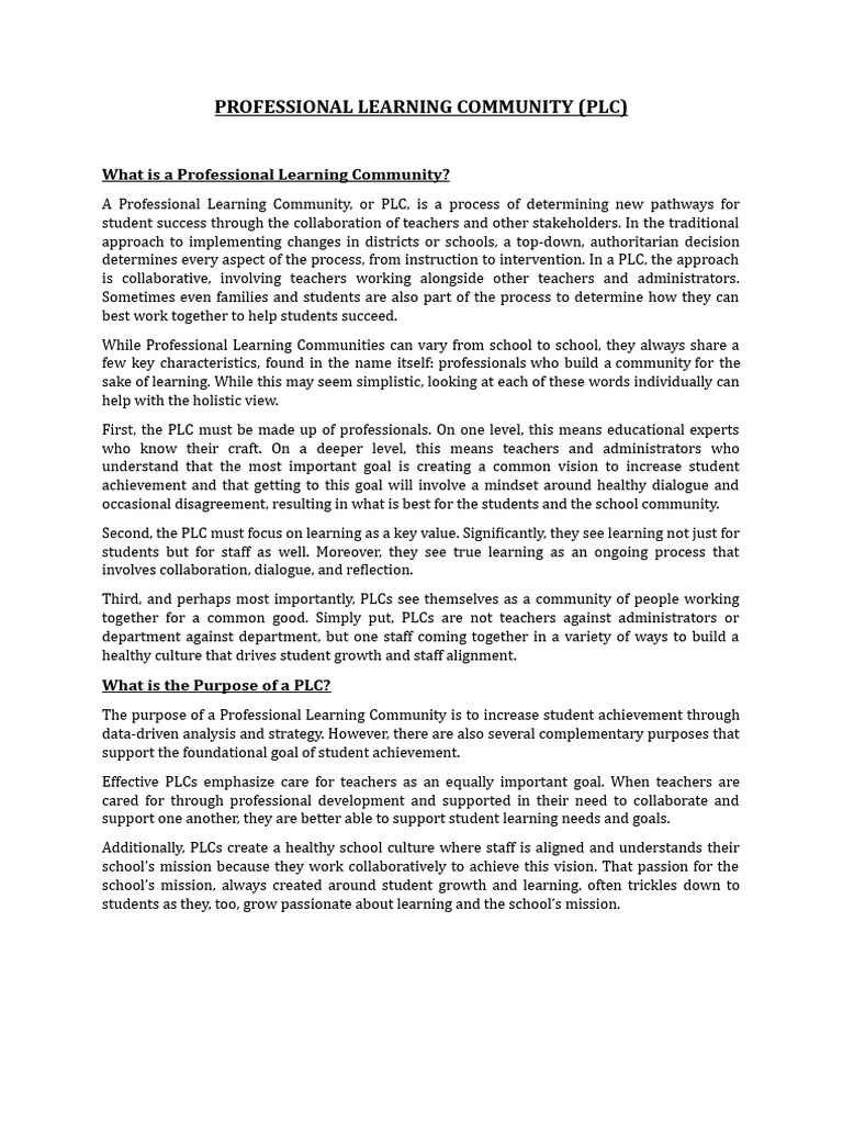 A Professional Learning Community, or PLC, is a process of determining new pathways for