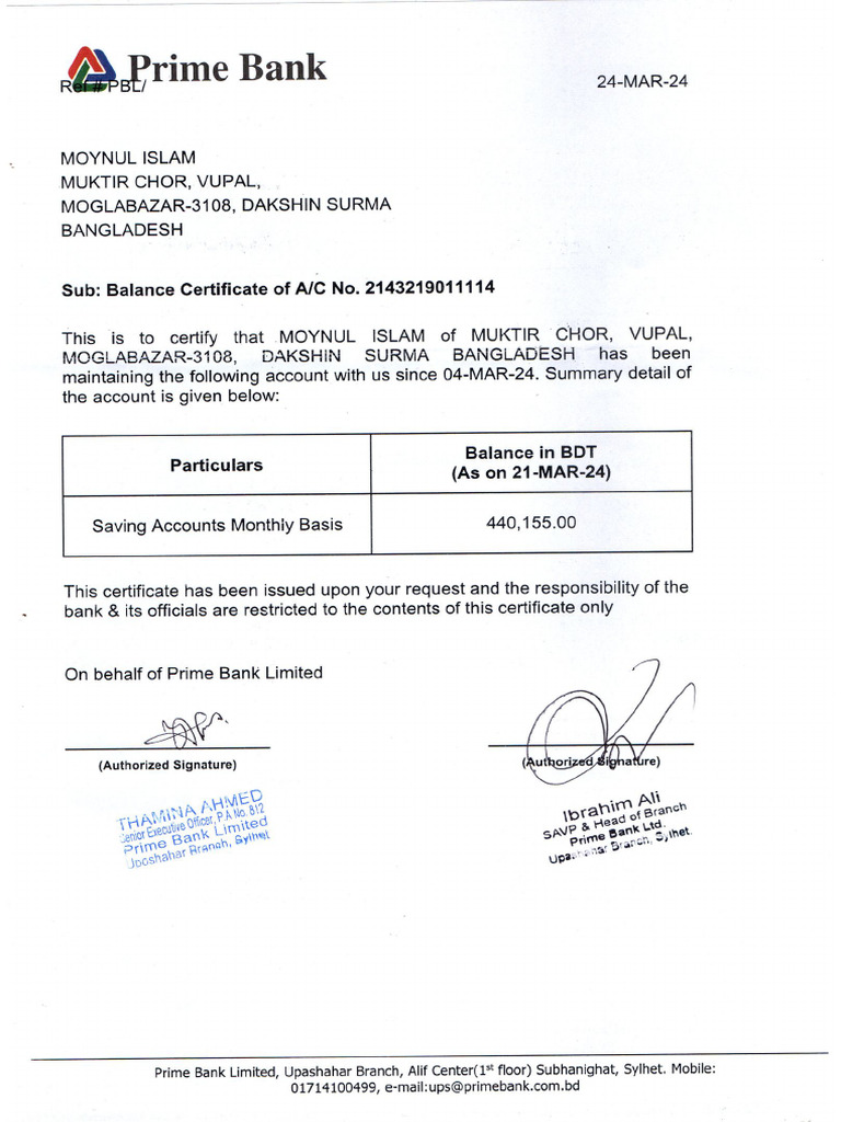 Prime Bank Limited, Upashahar Branch, Alif Center(1* floor) Subhanighat, Sylhet. Mobile: