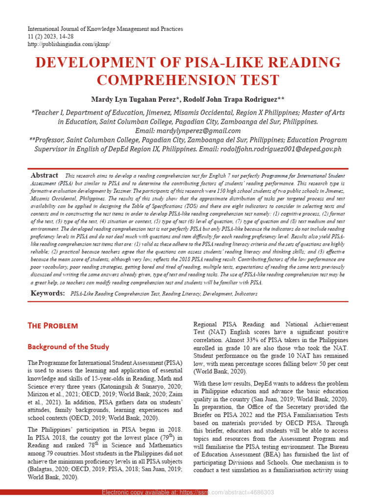 developing a PISA-like reading comprehension test, the test