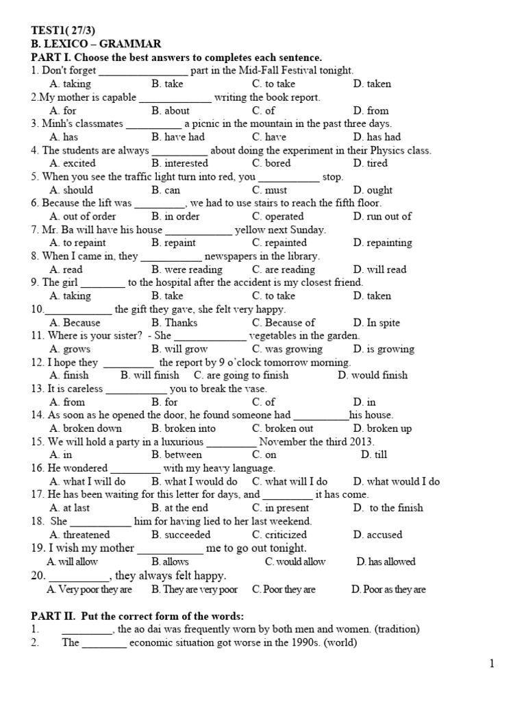 PART I. Choose the best answers to completes each sentence.