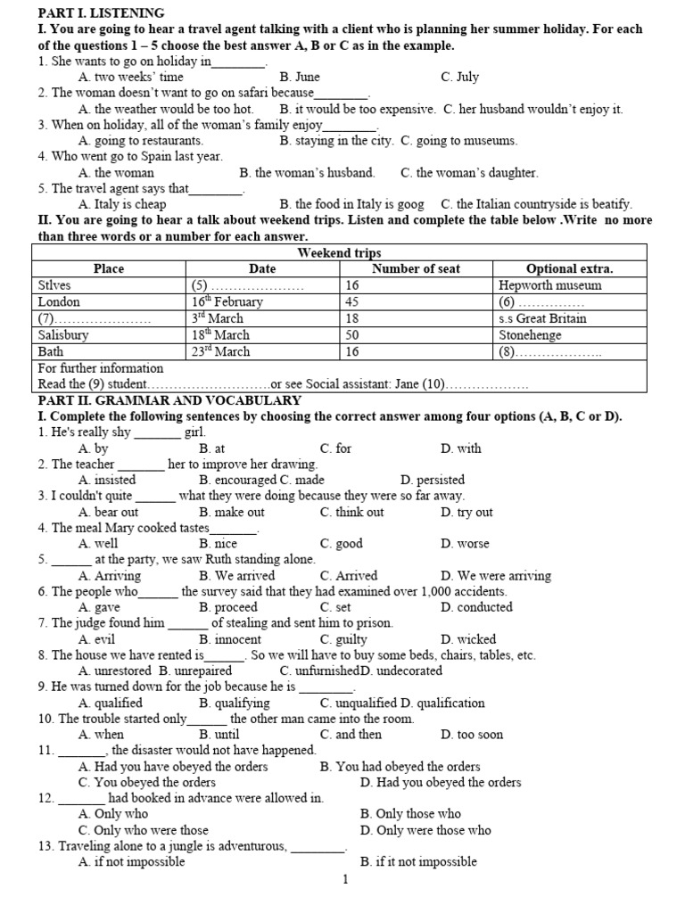 I. Complete the following sentences by choosing the correct answer among four options (A, B, C or D).