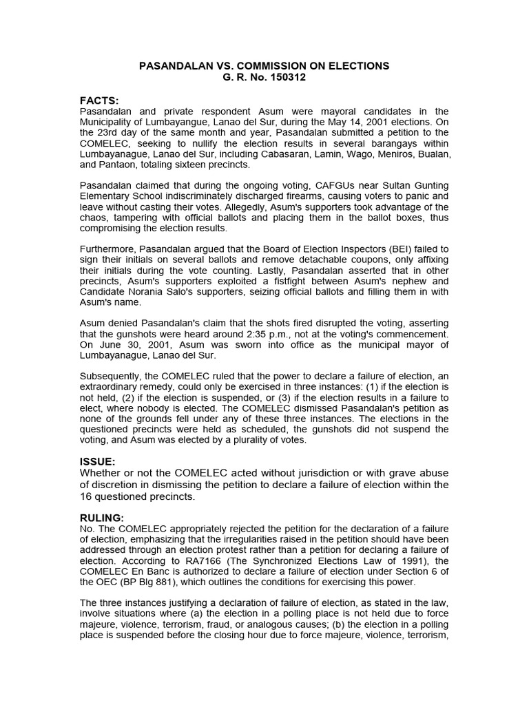 Pasandalan and private respondent Asum were mayoral candidates in the