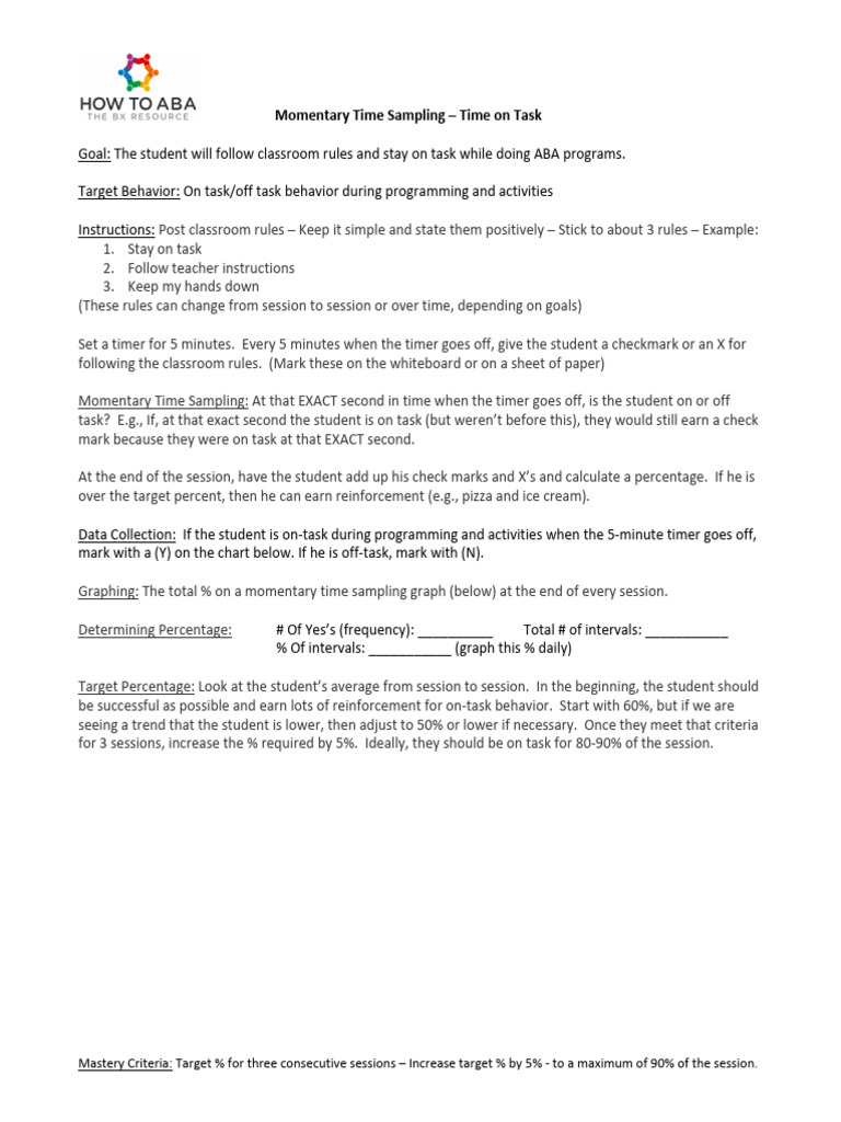 Mastery Criteria: Target % for three consecutive sessions – Increase target % by 5% - to a maximum of 90% of the session.