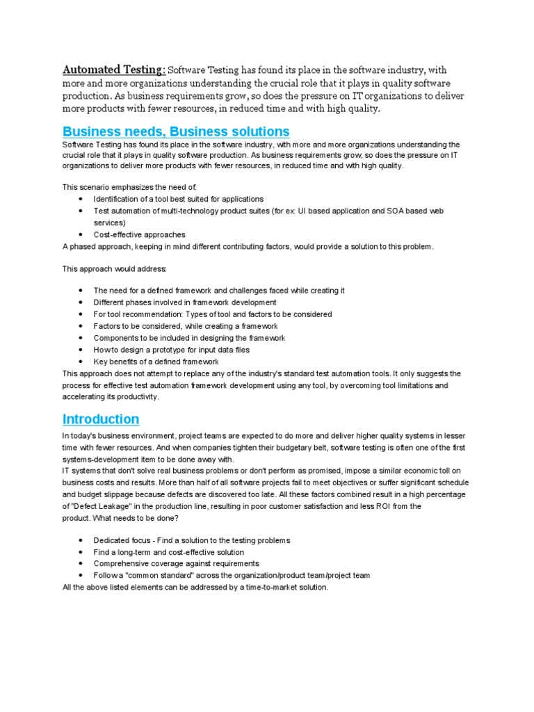 Software Testing has found its place in the software industry, with more and more organizations understanding the crucial role that it plays in quality software production. As business requirements grow, so does the pressure on IT organizations to deliver more products with fewer resources, in reduced time and with high quality. This scenario emphasizes the need of: Identification of a tool best suited for applications Test automation of multi-technology product suites (for ex: UI based application and SOA based web