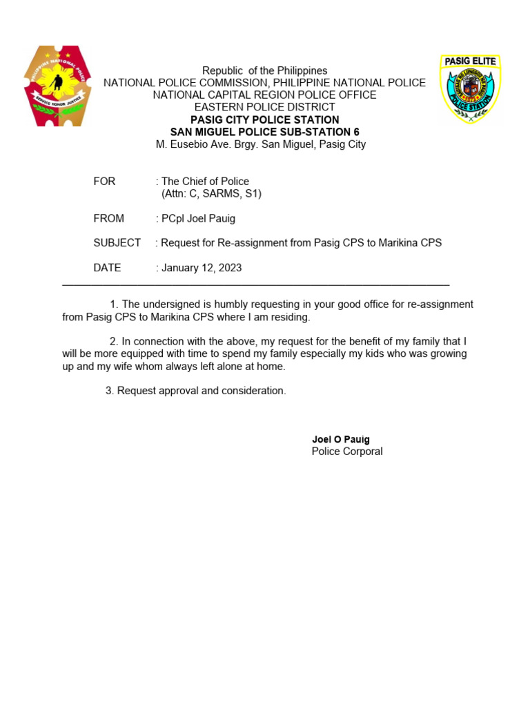 SUBJECT : Request for Re-assignment from Pasig CPS to Marikina CPS