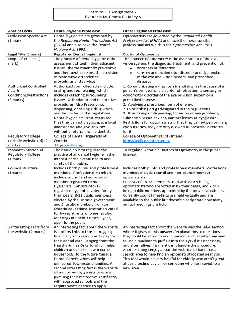 Area of Focus Dental Hygiene Profession Other Regulated Profession
