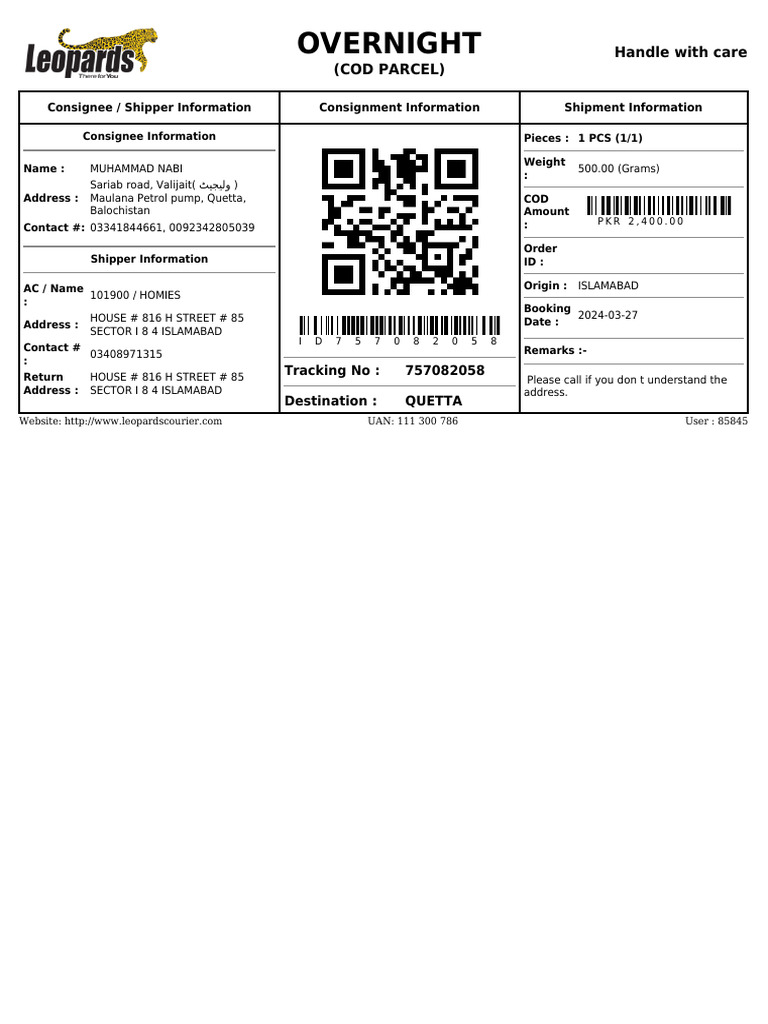 Return HOUSE # 816 H STREET # 85 Tracking No : 757082058